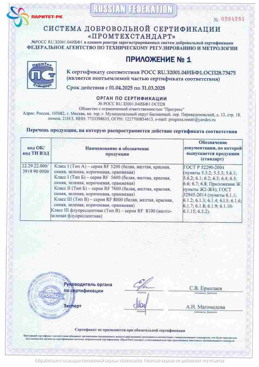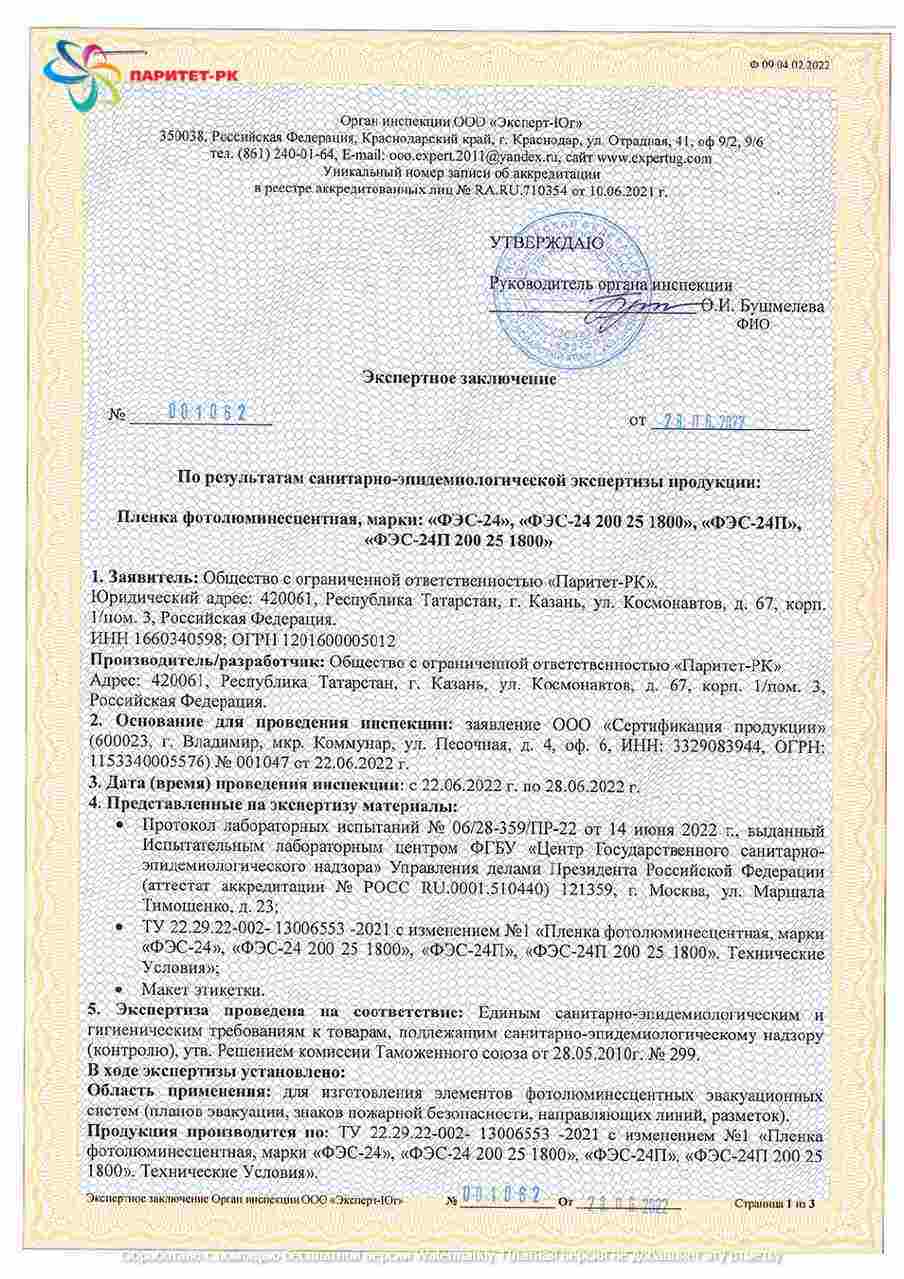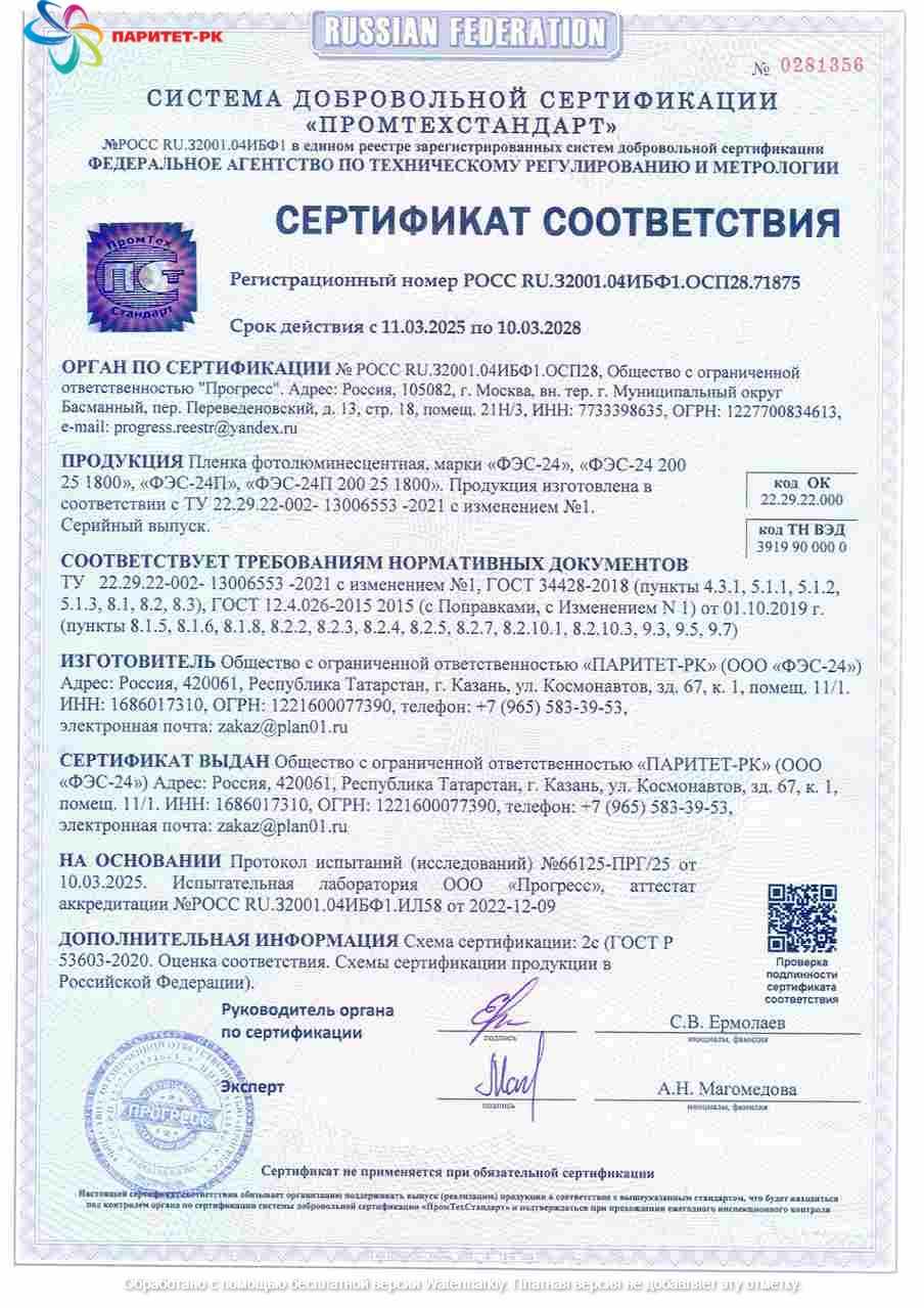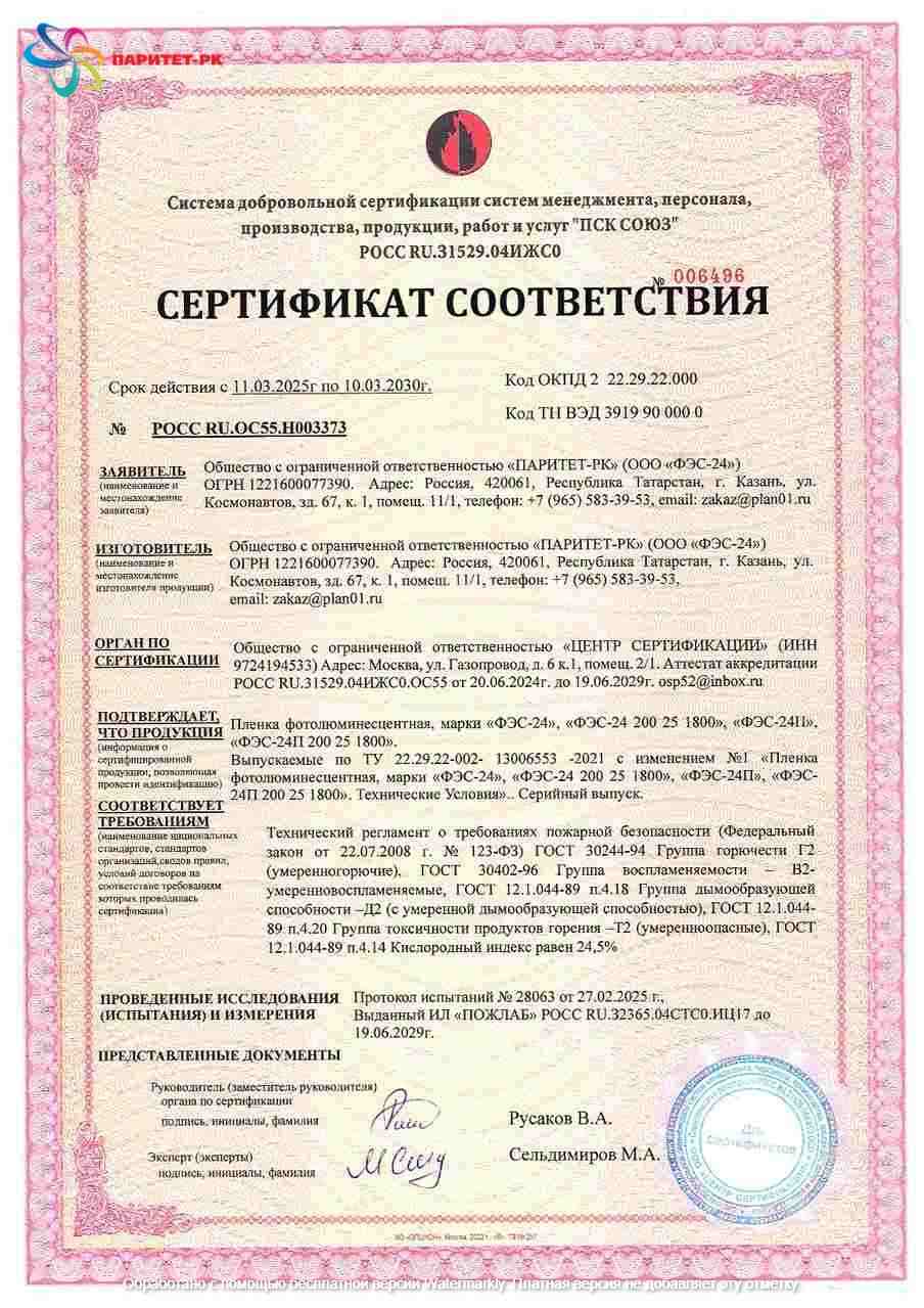 ООО "Паритет-РК" работает с 2012 года и является лидером на рынке фотолюминесцентной пленки в России. Продукция компании соответствует стандартам ГОСТ 12.4.026-2015 с изменением №1 от 01.10.2019 г. и ГОСТ 34428-2018, что подтверждается сертификатами безопасности.