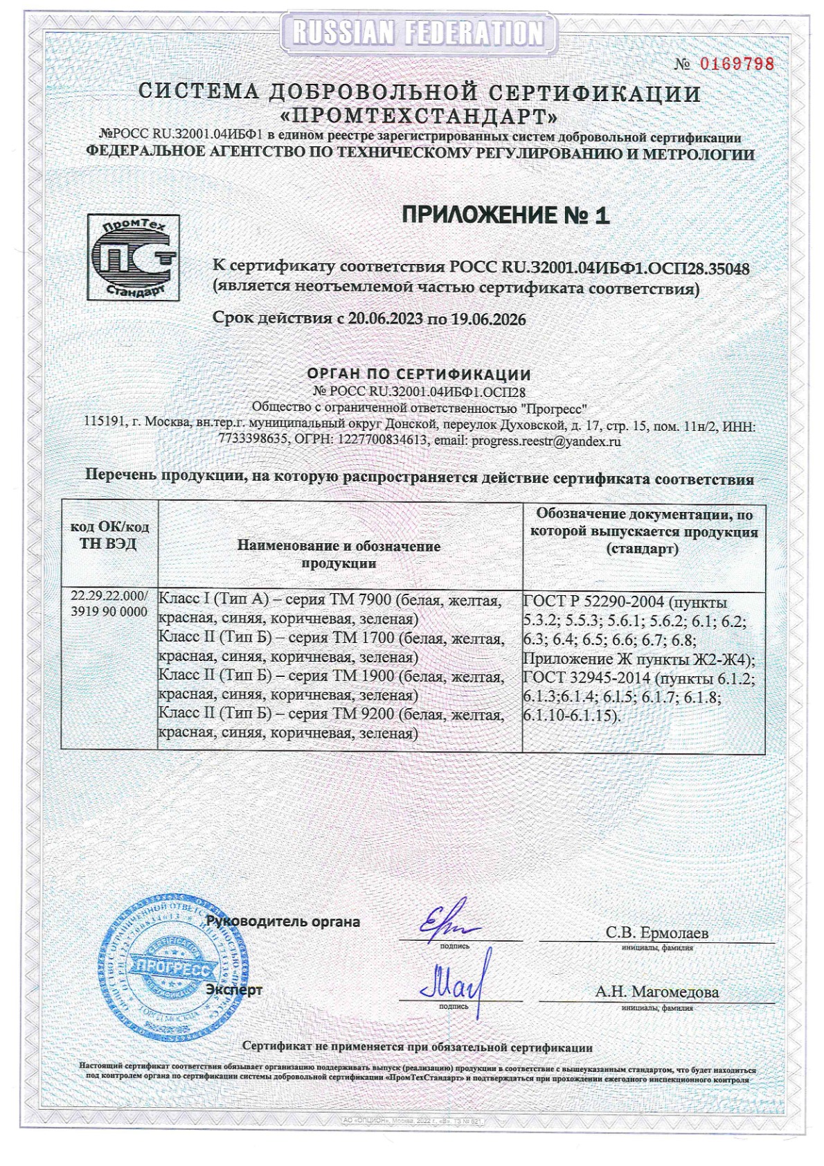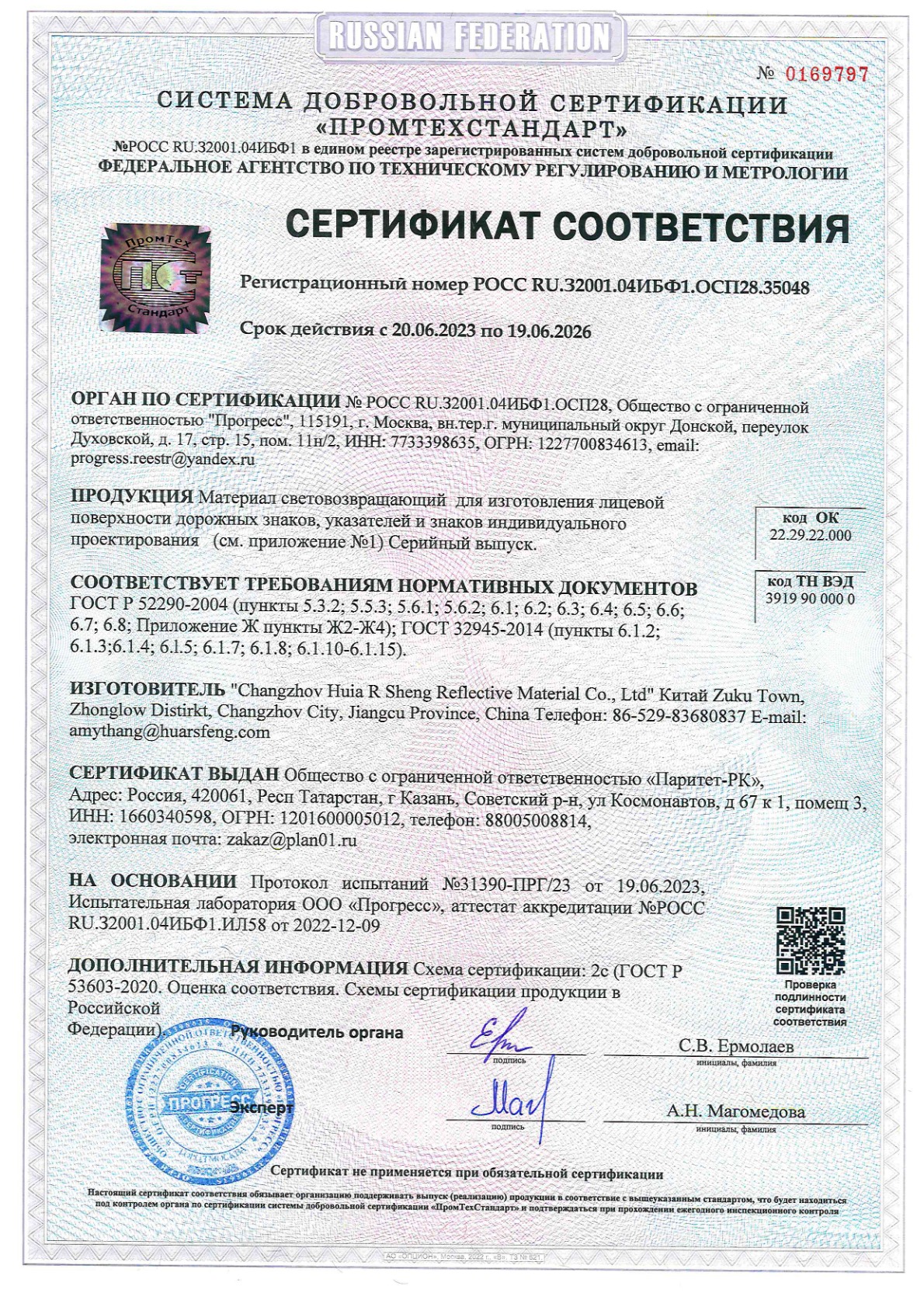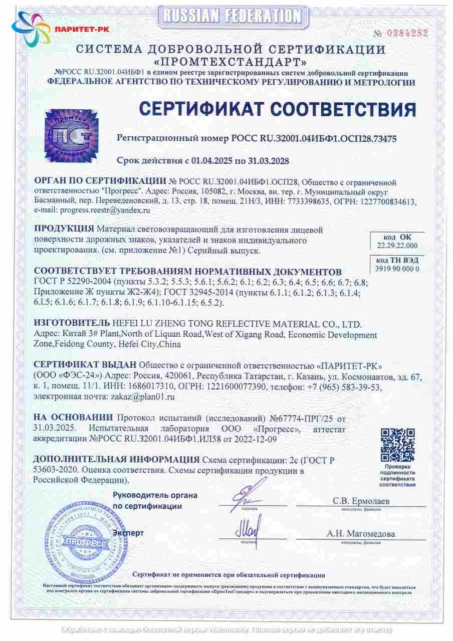 ООО "Паритет-РК" работает с 2012 года и является лидером на рынке фотолюминесцентной пленки в России. Продукция компании соответствует стандартам ГОСТ 12.4.026-2015 с изменением №1 от 01.10.2019 г. и ГОСТ 34428-2018, что подтверждается сертификатами безопасности.